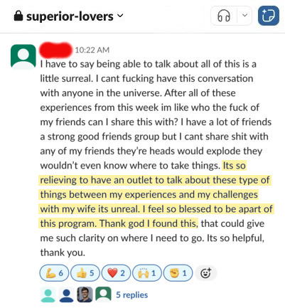 You'll be surrounded by men working towards the same goal. Learning from each other's wins, breakthroughs, and firsthand experiences.