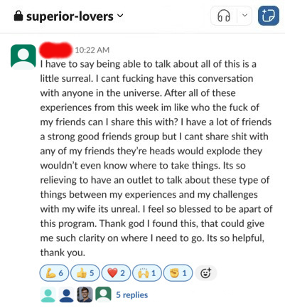 You'll be surrounded by men working towards the same goal. Learning from each other's wins, breakthroughs, and firsthand experiences.